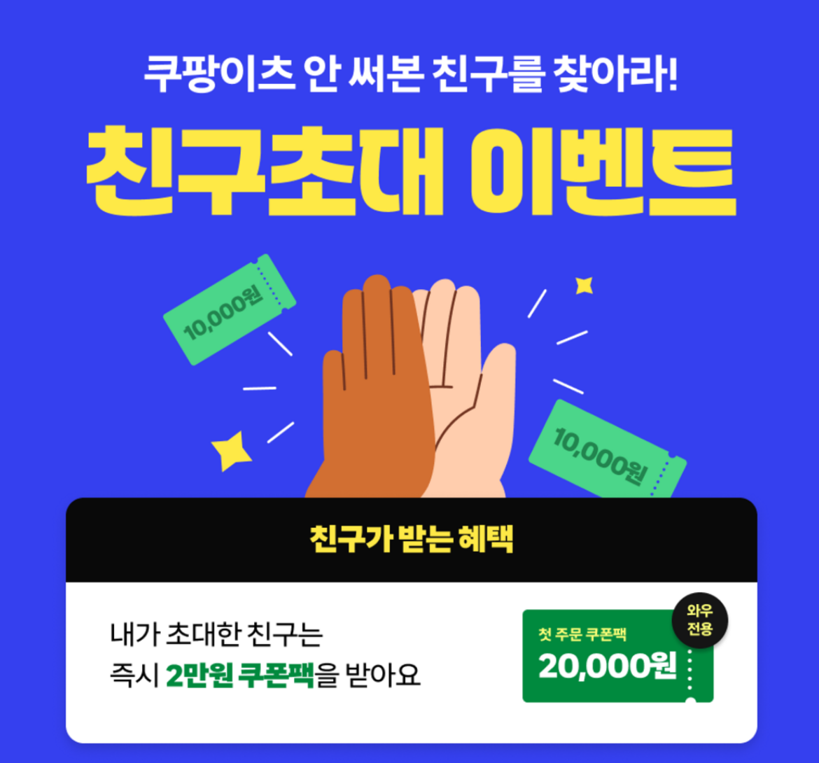 쿠팡이츠 첫주문자는아래 링크를 통해 가입하시면 20,000원 쿠폰팩을 받을 수 있습니다. 단, 와우 멤버십 회원이어야 20,000원 쿠폰팩 혜택을 받을 수 있으니 회원이 아니라면 잠시 가입하는 것 추천드립니다.